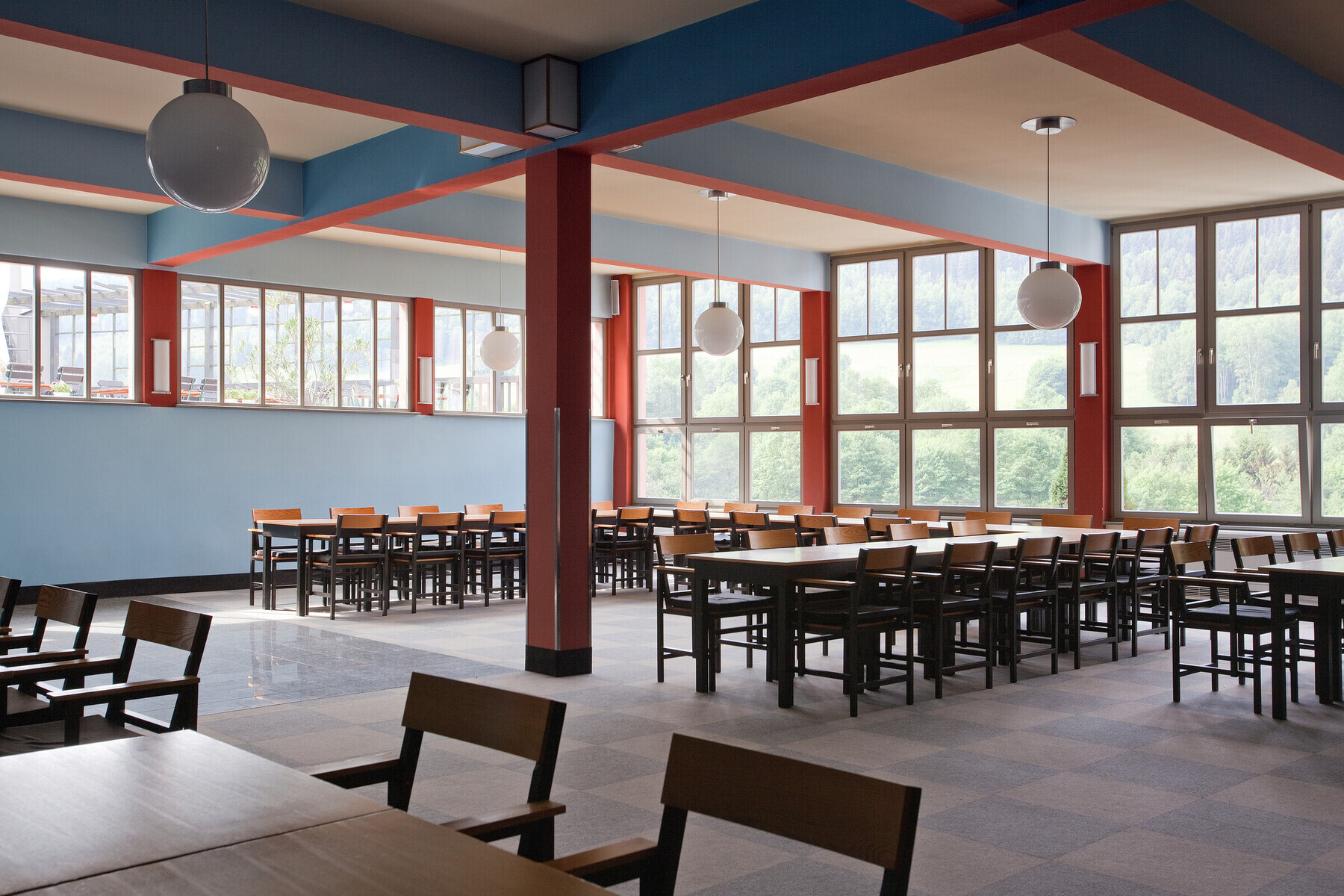 Das weithin sichtbare Gebäude erhebt sich mit seiner flächigen, nur spärlich gegliederten Hauptfront unter schieferbedecktem Walmdach förmlich über den kleinen Ort. Dass es sich um ein bedeutendes Zeugnis der Bauhaus-Architektur handelt, lässt das monumentale Haupthaus, eine Stahlbetonkonstruktion mit Wänden aus verputztem Mauerwerk, auf den ersten Blick nicht erkennen. Die geht noch auf die ursprünglichen Planungen von Klapproth zurück, die Alfred Arndt nicht mehr grundlegend ändern konnte. Im Inneren überrascht er jedoch mit der farbenfrohen Leichtigkeit des Neuen Bauens. Bei der Gestaltung der Räume erweist sich Alfred Arndt als Meister im Umgang mit Farbe. Im Raumprogramm spiegelt sich die funktionale Integration der verschiedenen Nutzungen.
